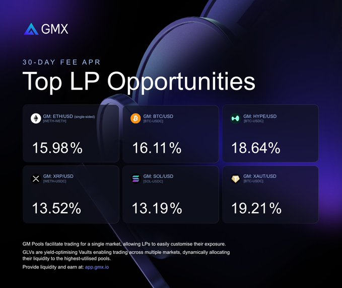 45,000명 이상의 사용자가 GMX의 유동성 공급 토큰(LP) $GM와 $GLV를 보유하고 있다는 사실을 알고 계셨나요? 누구나 유동성을 제공하고 세 가지 수익원을 통해 수익을 창출할 수 있습니다. 자본 이전하고 더 높은 수익을 얻으세요.