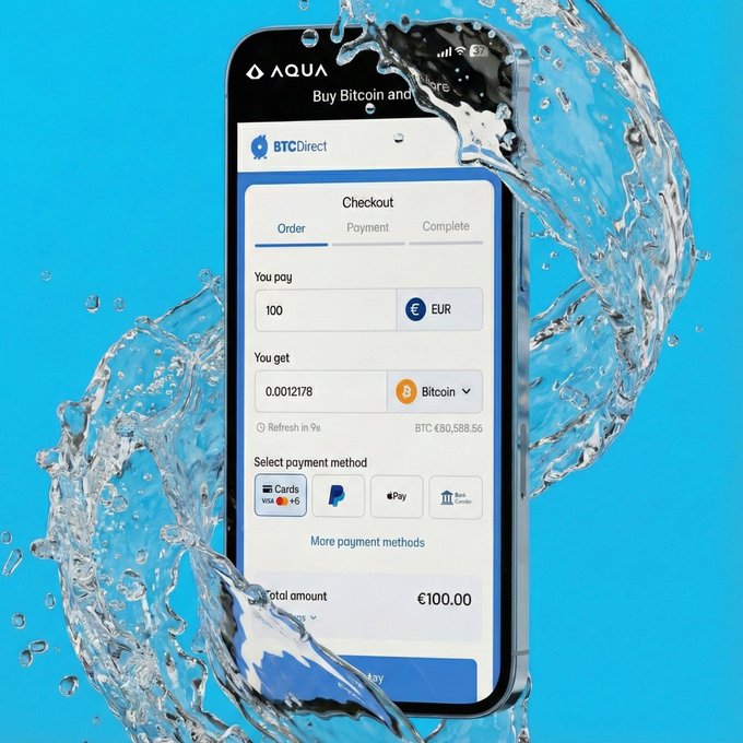 비트코인을 필요 이상으로 어렵게 만들지 마세요. AQUA에서 바로 구매할 수 있습니다. 카드, 페이팔, 애플페이, 계좌이체 등 모든 결제 방식을 빠르고 간편하게 이용할 수 있습니다. AQUA에 @btcdirect가 통합되어 있어, 원하는 결제 방식을 선택하면 비트코인이 즉시 지갑에 입금됩니다. 😎🐬