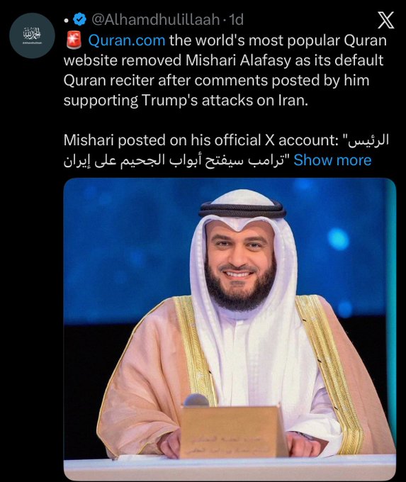 🚨🇰🇼🇺🇸속보: 유명한 쿠웨이트 셰이크 "미샤리 알 아파시"가 이란과의 전쟁에서 트럼프를 지지하는 트윗을 올린 후, 전 세계 무슬림들 사이에서 그의 쿠란 낭송을 기기와 앱에서 삭제하려는 대규모 캠페인이 진행 중입니다.