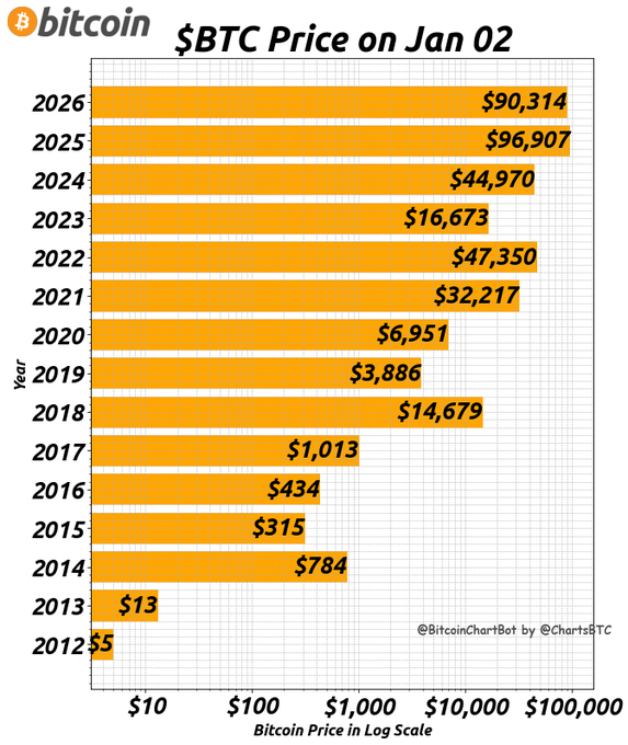 비트코인 연말 가격(2025년): 87,496달러 현재 가격(2026년 기준): 90,314달러 연초 누계(YTD) 변화율: 3% #비트코인 $BTC #비트코인연간캔들