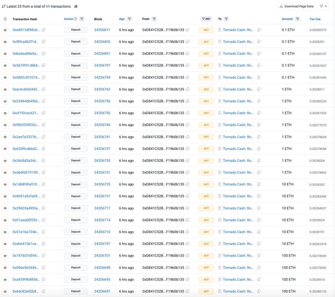 #PeckShieldAlert 해킹당한 지갑에서 2,730만 달러를 훔친 멀티시그 사기범이 아베(AAVE) 에서 1,000 $ETH (324만 달러)를 인출하여 #TornadoCash를 통해 자금 세탁했습니다. 그들은 지금까지 총 6,300달러(1,940만 달러)를 토네이도 캐시에 입금했습니다. 타협한 자를 조종하는 배수자