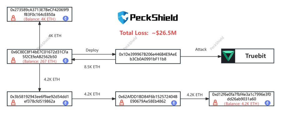 #PeckShieldAlert @Truebitprotocol 악용자가 훔친 자금(8,500 이더리움(ETH), 약 2,650만 달러 상당)을 #TornadoCash에 입금했습니다. twitter.com/PeckShieldAlert/st...