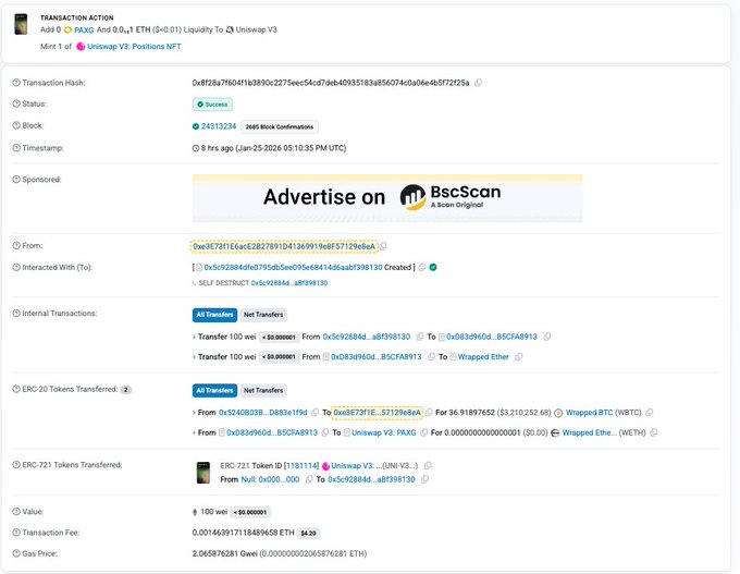 #PeckShieldAlert @makinafi 계정이 약 1,299 $ETH (약 413만 달러) 상당의 피해를 입었습니다. 해커는 MEV Builder(0xa6c2...)를 이용해 선점했습니다. 도난당한 자금은 현재 다음 두 주소에 보관되어 있습니다. 0xbed2...dE25 (330만 달러) 및 0x573d...910e (88만 달러)
