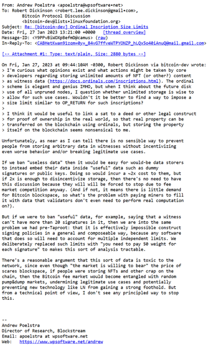 "기술적인 관점에서 볼 때, 이것을 막을 수 있는 원칙적인 방법은 보이지 않습니다." 우리 중 많은 사람들이 2023년에도 이 의견을 공유했고, 이 특정 게시물은 제가 2023년 2월에 @rodarmor 님과 함께한 팟캐스트 토론에서도 언급되었습니다. 110명의 지지자분들이 이 내용을 읽고 이해해 주시면 좋겠습니다. twitter.com/stephanlivera/stat...