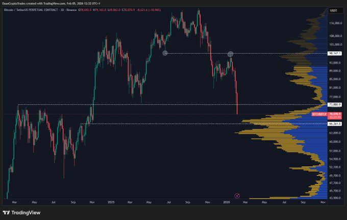 $BTC $74K 구간은 오래 버티지 못했네. 이제 트럼프 당선 전 2024년 가격대까지 다시 내려왔어. 여기서 가격 움직임은 꽤나 변동성이 컸고, BTC가 이 구간에서 약 8개월 정도 머물렀지. 지금은 어디서 횡보가 멈추는지 지켜보는 게 최선이야. 고점 거래량 구간이 어디서 지지가 나올지 대략 알려줄 수 있어. 내 전략은 변함없어. 알트엔 관심 없고, 트레이딩도 적극적으로 안 해. 가격이 더 떨어질 때마다 BTC 위주로 천천히 분할 매수 중이야. 키워드: 천천히.