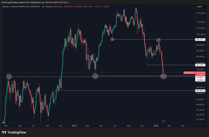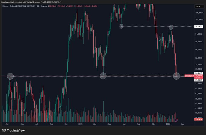 $BTC 2025년 4월 저점인 7만 4천 달러를 돌파했습니다. 2024년 3월 고점에서 바로 반등했습니다. 일일 종가가 중요할 것입니다.