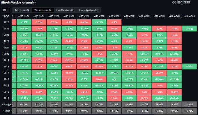$BTC 연말 몇 주 동안은 보통 흥미로운 가격 움직임이 크게 보이지 않습니다. 2013년, 2017년, 2020년을 제외하고는 전반적으로 매우 저조했습니다. 재밌는 건, 윤년의 하루가 추가되면 일반적으로 좋은 수익률을 보이는데, 전에는 이런 현상을 전혀 몰랐다는 겁니다. 전반적으로 새해까지는 큰 변동이 없을 것으로 예상합니다. 일반적으로 연말과 연초는 매우 불안정합니다. 특히 크리스마스 무렵에는 유동성과 거래량이 전반적으로 매우 낮습니다.