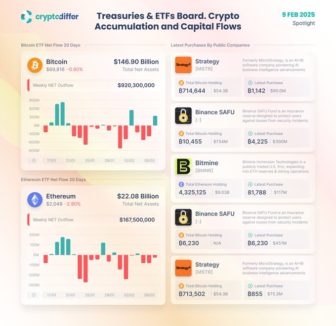국채 및 ETF 게시판. 암호화폐 축적 및 자본 흐름 선별적인 기업 자산 매입이 지속되는 가운데, @Strategy는 1,142 비트코인(BTC) (약 9천만 달러)를 추가 매입했습니다. 지난주 $BTC 및 $ETH 현물 ETF에서는 각각 약 9억 2천만 달러와 1억 6천7백만 달러의 순유출이 발생했습니다.