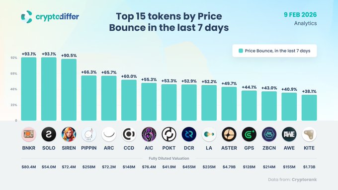 지난 7일간 가격 반등률 상위 15개 토큰 최근 하락세 이후 가장 강하게 반등한 토큰들입니다. 지난주 가격 회복률이 가장 높았던 상위 15개 토큰을 살펴보겠습니다. 최고 성과를 보인 토큰은 @Bankrbot($BNKR), @realSologenic($SOLO), @Genius_sirenBSC($SIREN)입니다.
