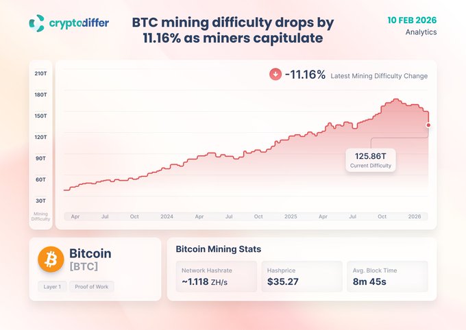 비트코인 채굴 난이도가 채굴자 항복으로 11.16% 하락했습니다. #비트코인 $BTC 채굴 난이도가 2021년 이후 최대 폭으로 하락하여 채굴자 에게 압박이 가중되고 있음을 시사합니다. 이러한 조정은 수익성 악화로 인해 재정적으로 취약한 업체들이 사업을 중단하면서 발생한 # 전부 매도(Capitulation) 에 따른 것입니다.