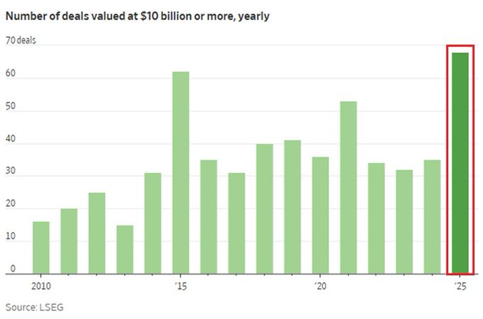 글로벌 M&A 시장이 역사적인 한 해를 기록했습니다. 2025년에는 100억 달러 이상 규모의 글로벌 M&A 거래가 68건에 달했습니다. 이는 전년 대비 거의 두 배 증가한 수치이며, 2023년과 2024년의 합계를 넘어섰습니다. 참고로, 이전 최고 기록은 2015년의 62건이었습니다. 이러한 대규모 거래는 전반적인 M&A 활동을 견인하여 연평균 거래 규모를 전년 대비 62% 증가한 2억 2,700만 달러로 끌어올렸으며, 이는 1999년의 최고 기록인 2억 2,500만 달러를 넘어선 수치입니다. 또한 이는 연평균 M&A 거래 규모가 2년 연속 증가한 것을 의미합니다. 기업 간 거래는 그 어느 때보다 활발합니다.