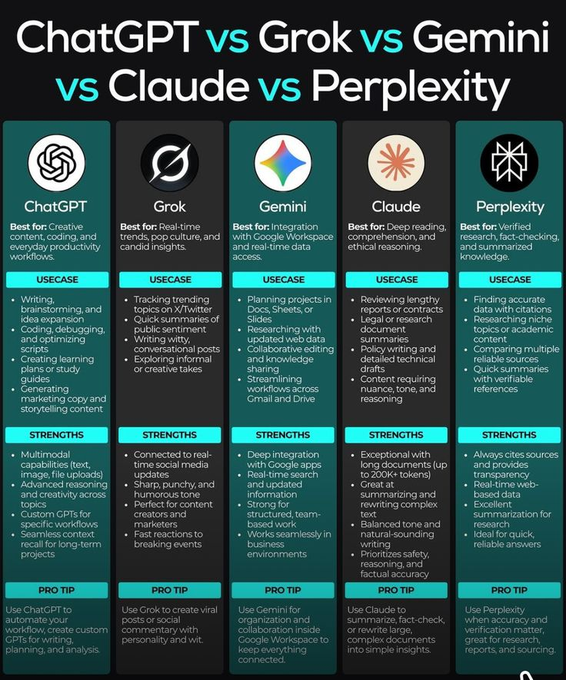 잘못된 AI 도구를 선택하면 LLM 응답이 망가집니다. 잘못된 AI 모델을 고르지 말고, 이 치트 시트를 저장해 두세요. ChatGPT vs. Grok vs. 제미니(Gemini) vs. Claude vs. Perpexity👇