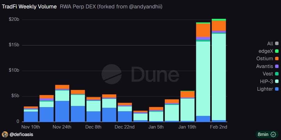 데이터: RWA Perp DEX의 TradFi 자산에 대한 주간 거래량이 200억 달러에 달했습니다.