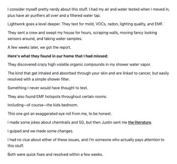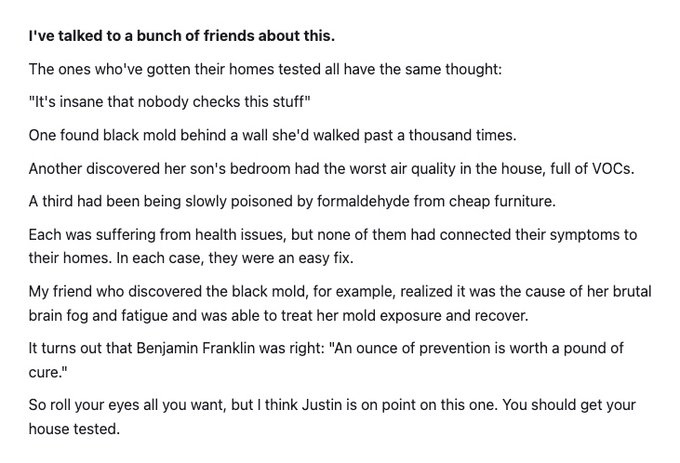 저희는 @awilkinson 님의 집을 검사했습니다. 그는 건강에 굉장히 신경 쓰는 분이고 (집 상태도 최상급이었습니다), 그럼에도 불구하고 개선할 여지는 발견했습니다. 그는 검사 후 이렇게 말했습니다. "이 문제에 대해 여러 친구들과 이야기를 나눠봤는데, 집을 검사받아본 친구들은 모두 똑같은 생각을 했습니다. '이런 걸 아무도 확인하지 않는다는 게 말이 안 돼.'"