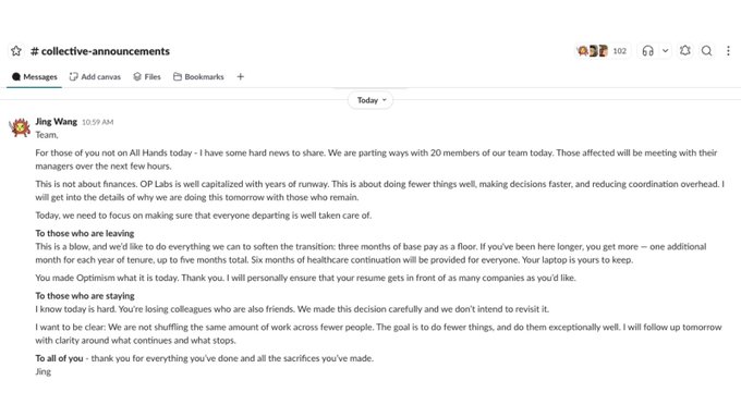 오늘 저희는 옵티미즘(OP) Labs 팀에게 어려운 소식을 전했습니다.