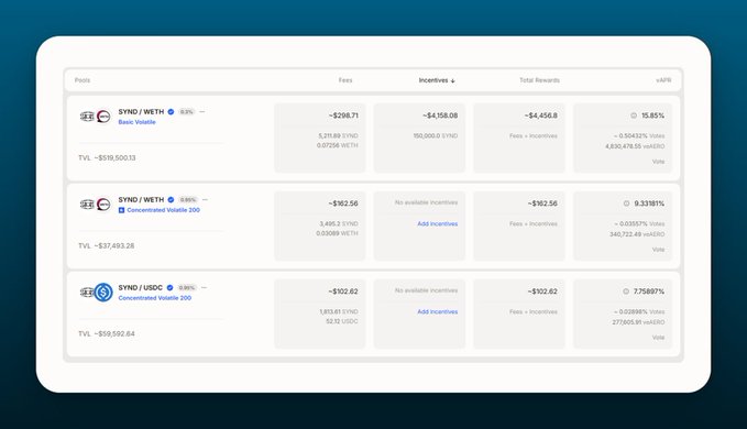 이번 주 @AerodromeFi에 입금된 투표 인센티브: 150K SYND → SYND/WETH 기본