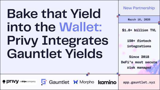 Privy와 Gauntlet, 스마트 지갑에서 온체인 수익 창출 프로그램 제공 위해 파트너십 체결 @privy_io 인프라를 사용하는 개발자는 지갑에서 직접 수익 창출 프로그램을 제공할 수 있습니다. 애플리케이션이 @Morpho 및 @kamino에서 당사의 수익 창출 전략을 통합하면 사용자는 유휴 잔액에 대해 수익을 얻을 수 있습니다.