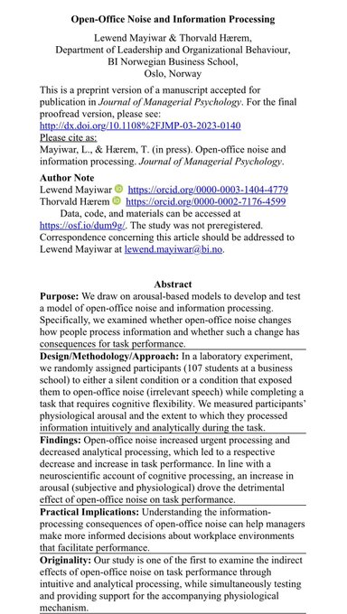 여러 실험 결과에 따르면, 개방형 사무실의 배경 소음은 분석 작업 능력을 저하시키고, 소프트웨어 버그 발생률을 높이며, 버그를 찾아내는 능력을 떨어뜨립니다. 개방형 사무실은 개인 작업에 적합하지 않습니다. twitter.com/emollick/status/20...