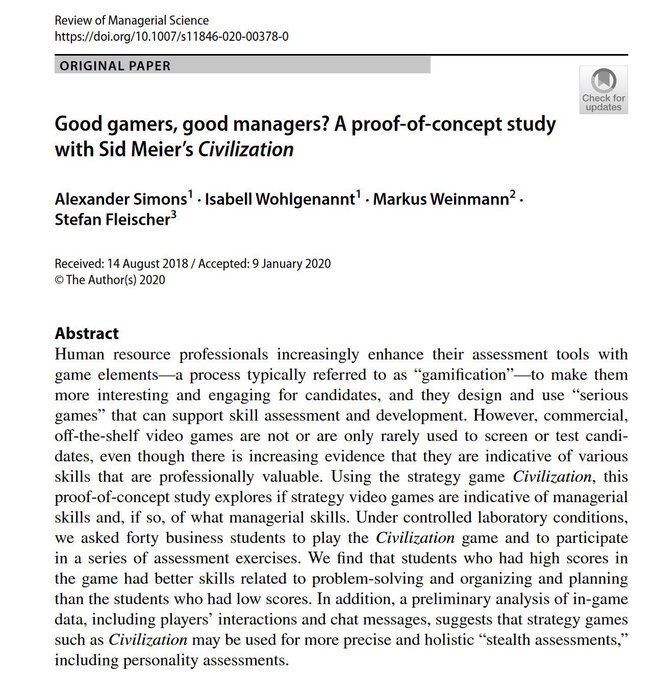 심시티는 아니지만, 이 작은 실험에서 문명 5를 잘했던 경영대학원 학생들이 기획, 조직, 문제 해결 능력도 더 뛰어난 것으로 나타났습니다. twitter.com/emollick/status/20...
