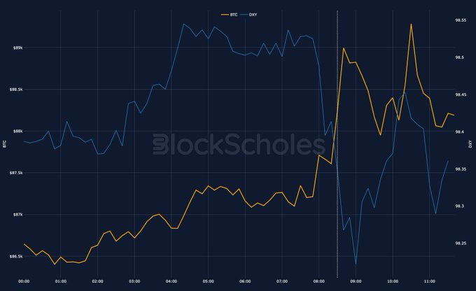 📊 예상치 못한 인플레이션: 달러 약세 속 비트코인(BTC) 강세 🧭 미국 동부시간 오전 8시 30분, 11월 미국 소비자물가지수(CPI) 상승률이 전년 동기 대비 2.7%로 예상치를 하회하며 발표되었습니다. 차트에서 점선은 해당 발표 시점을 나타내며, 발표 이후 비트코인(BTC) 상승한 반면 달러화 지수(DXY)는 하락했습니다. 💭 어떻게 생각하세요?