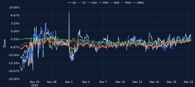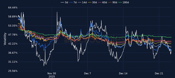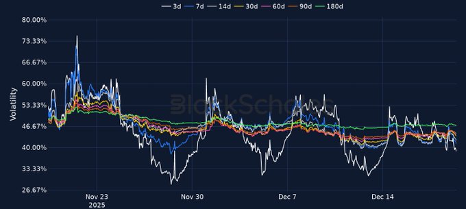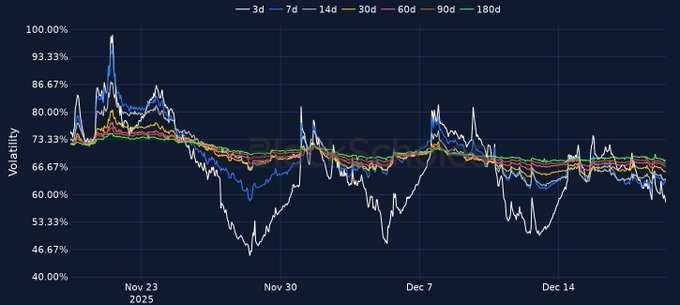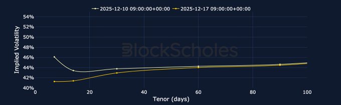📊 BlockScholes x @Bybit_Learn : 산타 집회가 임박했다는 징후는 없습니다 1/ 🧮 비트코인(BTC) 변동성은 11월 말 급등 이후 정상화되었지만 여전히 높은 수준입니다. 7일 등가격 변동성 지표는 최근 최고치보다 훨씬 낮으며, 실현 변동성 또한 이전 극단치에서 하락했습니다. 또한 비트코인(BTC) 기간 구조는 이제 숏 만기 부근에서 반전되는 것이 아니라 상승 추세를 보입니다.