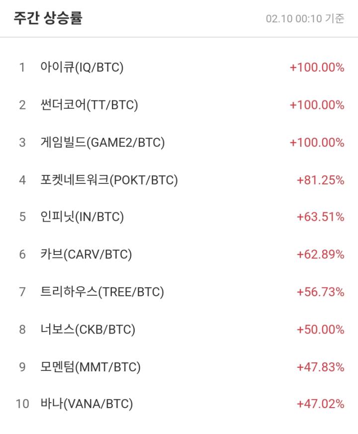 [코인 TOP 10 주간동향] IQ·썬더코어·게임빌드 100% 급등…AI·인프라 토큰 강세 집중