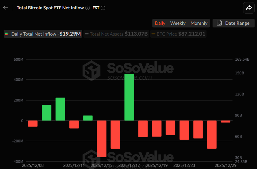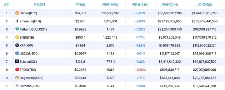 [저녁 시세브리핑] 암호화폐 시장 약세 지속… 비트코인 87,326달러, 이더리움 2,942달러