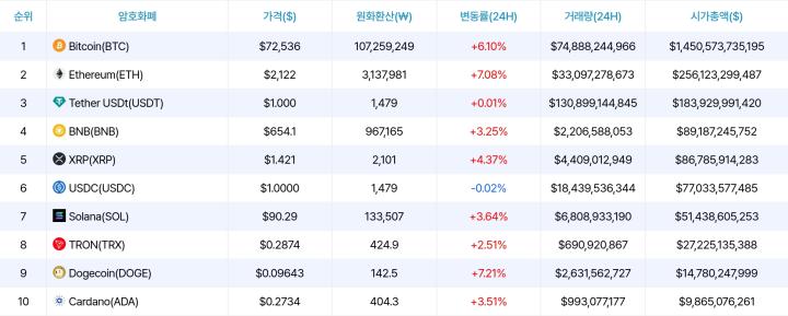 [오후 시세브리핑] 암호화폐 시장 혼조세… 비트코인 72,510달러, 이더리움 2,122달러