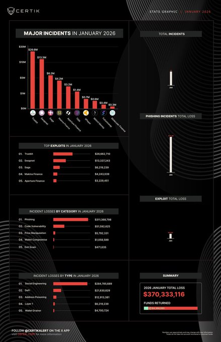 #CertiKStatsAlert 🚨 1월에 발생한 모든 사건을 종합한 결과, 악용으로 인한 손실액이 약 3억 7,030만 달러에 달하는 것으로 확인되었습니다. 이 중 약 3억 1,130만 달러는 피싱 공격으로 인한 것이며, 한 피해자는 소셜 엔지니어링 사기로 약 2억 8,400만 달러의 손실을 입었습니다. 자세한 내용은 아래를 참조하세요 👇