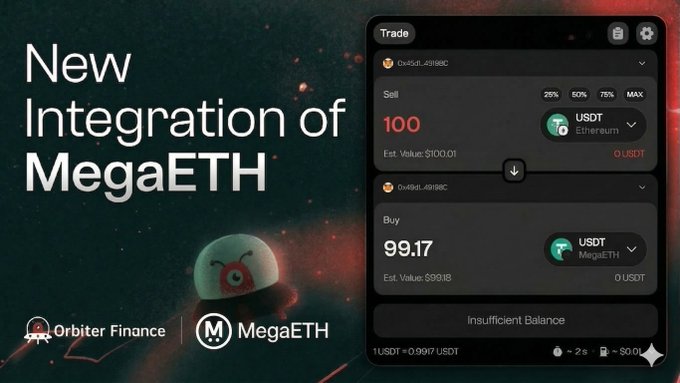 MegaETH와의 새로운 통합 🐰 @megaeth는 실시간 블록체인입니다. $ETH 및 $USDT을 MegaETH에 연결하고 더 많은 정보를 확인해 보세요: orbiter.finance/trade/Ethereum...…