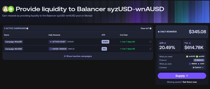 @monad에서 엄청난 수익 창출 기회가 나타났습니다! @Balancer의 지원을 받는 syzUSD-AUSD 유동성 공급자(LP) 이제 @Neverland_Money가 @merkl_xyz를 통해 배포하는 푸짐한 $DUST 인센티브로 더욱 강화되었습니다. 이 수익 창출 기회를 하락 🧵 👇