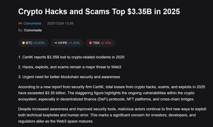 2025년에는 암호화폐 해킹, 절도 및 사기로 인해 33억 5천만 달러 이상이 손실될 것으로 예상됩니다. 이 문제를 해결할 방법이 무엇인지는 확실하지 않지만, 매년 이렇게 많은 돈이 손실되고 있다는 사실은 정말 무섭습니다. DeFi가 대중적으로 보급되려면 더 안전해져야 합니다.