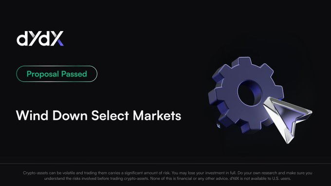 투표 통과 ✅ 커뮤니티는 PROVE, BRETT, ES, PROMPT, TREE, 아르고(Aergo), ID, 루나(LUNA), 엔진(ENJ), GALA, 쎄타 토큰(THETA), AIXBT, 테조스(XTZ), 스팀(Steem), GAS 및 NOT 마켓의 운영 종료를 승인했습니다. 🗳 mintscan.io/dydx/proposals/361…