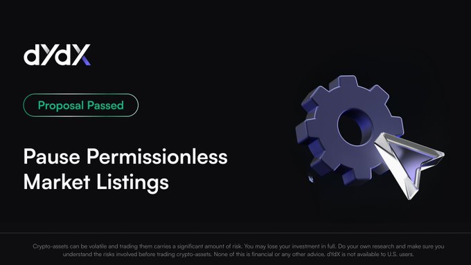 투표 통과 ✅ 커뮤니티는 모든 비허가형(Permissionless) 상품 등록을 일시적으로 중단하기 위해 시장의 최대 등록 한도를 0으로 설정하는 것을 승인했습니다. 🗳 mintscan.io/dydx/proposals/366…
