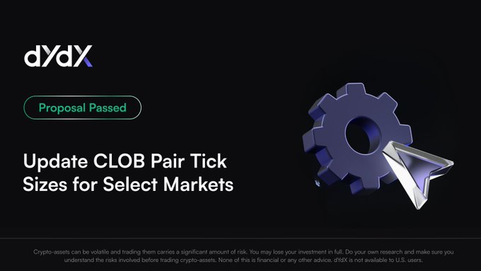 투표 통과 ✅ 커뮤니티는 MANA, MNRY, MOVE, ONDO, ORDI, PEOPLE, POL, POPCAT, PYTH, RAY, RUNE, 세이(Sei), 신세틱스(SNX), STRK, 스택스(STX), S, TIA 및 USELESS 시장의 CLOB 쌍 틱 사이즈 업데이트를 승인했습니다. 🗳 mintscan.io/dydx/proposals/364…
