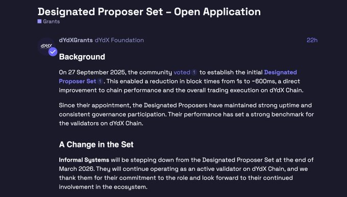 지정 제안자 명단에 한 자리가 공석이 되어 지원 신청을 받고 있습니다. 2025년 9월에 해당 데이터셋이 구축된 이후, 디와이디엑스(DYDX) 의 블록 시간은 1초에서 약 600밀리초로 단축되었습니다. MEV 위원회와 디와이디엑스(DYDX) 보조금 담당자는 기술적 역량, 가동 시간 및 대응력을 기준으로 지원자를 평가합니다. 지원 마감일은 3월 17일입니다.