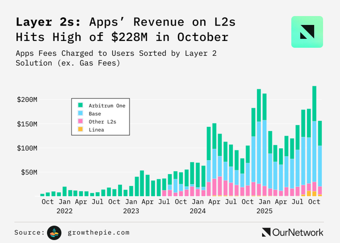 10월은 L2 앱 매출이 역대 최대를 기록한 달로, 2억 2,800만 달러라는 새로운 최고치를 경신했습니다. @ournetwork__의 최신호에서 업계 전반에 대한 자세한 내용을 확인하세요 👇 ournetwork.xyz/p/on-382-layer-...…