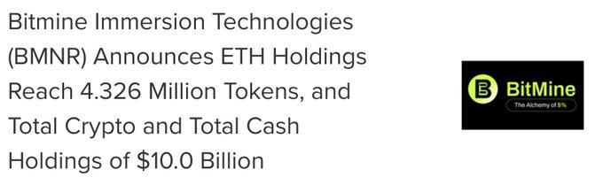 .@BitMNR은 지난주 약 8,600만 달러 상당의 40,613 $ETH를 인수했습니다. 이 회사는 약 92억 달러 상당의 43억 2,600만 $ETH를 보유하고 있습니다. prnewswire.com/news-releases/b...…