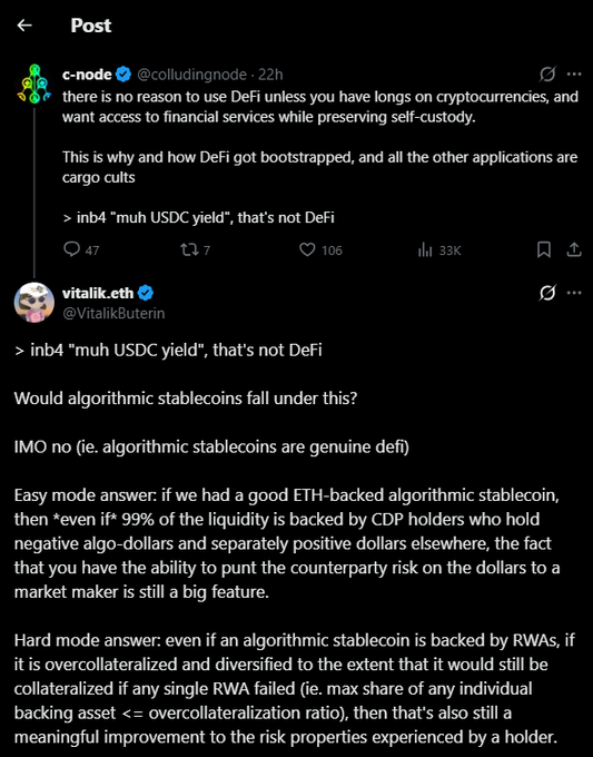 비탈릭 부테린은 이더리움 기반 DeFi 생태계가 USDC와 같은 중앙 집중식 스테이블코인에 지나치게 의존하고 있어 "단일 실패 지점" 위험을 초래한다고 경고합니다. 그는 "USDC 수익률" 상품들이 진정한 탈중앙화 위험 관리 없이 수익률만을 쫓고 있다고 비판합니다. 비탈릭은 ETH 기반 스테이블코인이나 높은 담보를 통해 위험을 분산시킨 실물 자산 스테이블코인과 같은 대안 모델을 옹호합니다. 그는 수십억 개의 USDC가 대출 거래를 장악하고 있는 Aave를 예로 들며 현재의 문제를 지적합니다. 비탈릭은 DeFi가 중앙 집중식 기관에 대한 의존도를 줄이고 장기적으로 더욱 자율적이고 지속 가능한 시스템을 구축해야 한다고 강조합니다.