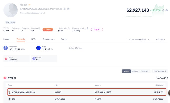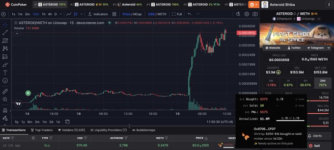 이 남자는 단 이틀 만에 575달러를 100만 달러 이상으로 불렸습니다. 무려 1,700배가 넘는 수익률이죠! 😱 그는 4월 17일에 575달러로 27억 9천만 달러($ASTEROID)를 매입했는데, 현재 그 가치는 100만 달러가 넘습니다. 정말 놀랍네요! dexscreener.com/ethereum/0x76a...…