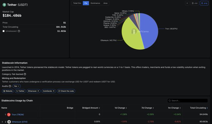지난주에 트론(TRON) 에서 2B $USDT가 발행되었습니다. 현재 트론(TRON) 에서 유통되는 USDT는 약 846억 5천만 개이며, 이는 전체 시장의 45.87%를 차지합니다.