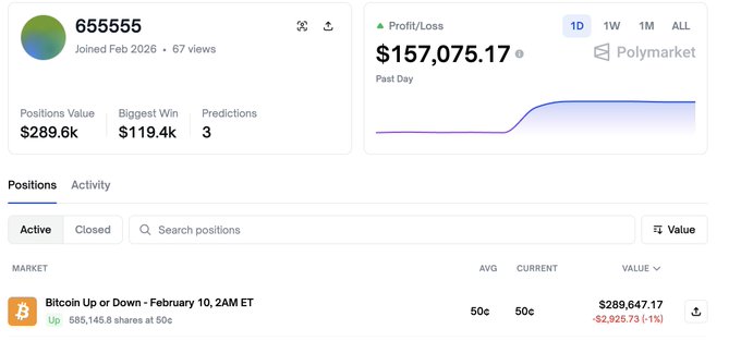 655555라는 닉네임을 사용하는 트레이더는 $BTC와 $ 이더리움(ETH) 의 가격 변동에 베팅하여 12시간도 안 되어 15만 7천 달러를 벌었습니다. 그는 이번에도 29만 2,600달러를 투자하여 비트코인 가격이 2월 10일 오전 2시(미국 동부시간)까지 오를 것이라고 예상했습니다. polymarket.com/0x87631b8159ac0...…
