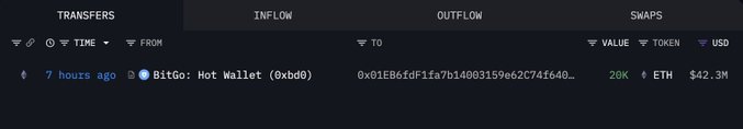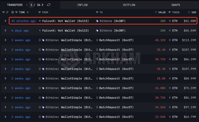 Tom Lee(@fundstrat)의 #Bitmine이 약 40분 전에 #FalconX로부터 2만 달러 상당의 이더리움(ETH)(4,108만 달러)를 추가로 매입했습니다. intel.arkm.com/explorer/entity...…