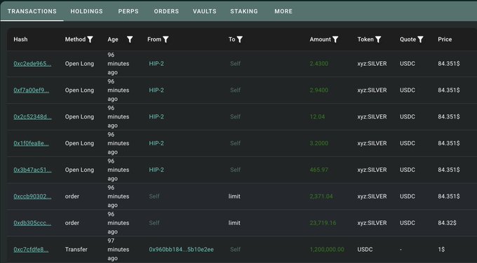 고래 투자자가 지난 2시간 동안 두 개의 지갑(0x7f33 및 0x960B)을 사용하여 은(SILVER)에 대해 2배의 롱 포지션을 개설했습니다. 총 포지션: 57,250 xyz:SILVER($473만) hypurrscan.io/address/0x7f3399...… _2024111120231_|