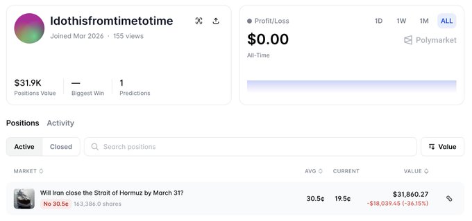 누군가 3시간 전에 "Idothisfromtimetotime"이라는 새 지갑을 만들고 이란이 3월 31일까지 호르무즈 해협을 폐쇄하지 않을 것이라는 데 5만 달러를 걸었습니다. 현재 그는 이미 1만 8천 달러(-36.15%)를 잃었습니다. 그가 잘못된 정보를 얻은 걸까요? polymarket.com/0xe81352293f82e...…