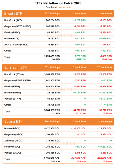 2월 9일 업데이트: #비트코인 ETF: 1일 순유입량: +3,286 비트코인(BTC)(+2억 2,777만 달러)🟢 7일 순유입량: -6,069 비트코인(BTC)(-4억 2,076만 달러)🔴 #이더리움 ETF: 1일 순유입량: -54,718 이더리움(ETH)(-1억 1228만 달러)🔴 7일 순유입량: -93,712 이더리움(ETH)(-1억 9,230만 달러)🔴 # 솔라나(Solana) ETF: 1D 순유입: -142,052달러 솔라나(SOL)(-1207만 달러)🔴 7일 순유입: -208,067달러 솔라나(SOL)(-1769만 달러)🔴 x.com/lookonchain/status/20197...…