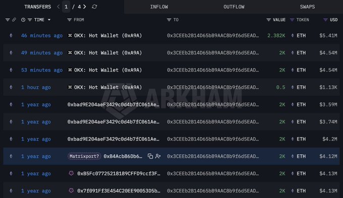 #Matrixport와 연결된 지갑 0x3CEE가 1년간의 활동이 없다가 지난 한 시간 동안 오케이엑스(OKX) 에서 6,382.5 $ETH (1,450만 달러)를 인출했습니다. 현재 지갑에는 18,383 이더리움(ETH)(4,175만 달러)가 보관되어 있습니다. intel.arkm.com/explorer/addres...…