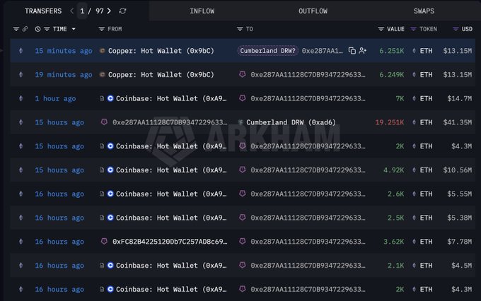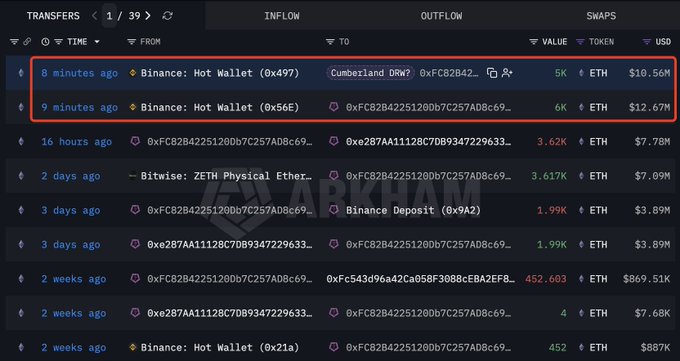 기관 투자자들이 이더리움 (이더리움(ETH) 매수하고 있을지도 모릅니다! 지난 16시간 동안 #Cumberland와 연결된 2개의 지갑에서 바이낸스, 코인베이스, 코퍼에서 총 46,620 이더리움(ETH)(9,880만 달러)를 인출했습니다. intel.arkm.com/explorer/addres...… intel.arkm.com/explorer/addres...…
