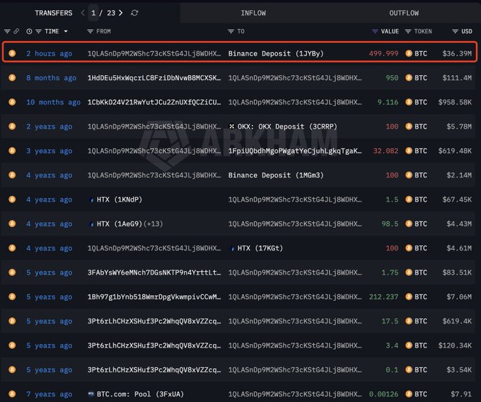 #Bitcoin OG 지갑(1QLASn)이 8개월간의 활동이 없다가 2시간 전에 #Binance에 500달러 상당의 비트코인(BTC)(3,639만 달러)를 입금했습니다. intel.arkm.com/explorer/addres...…