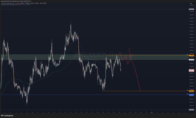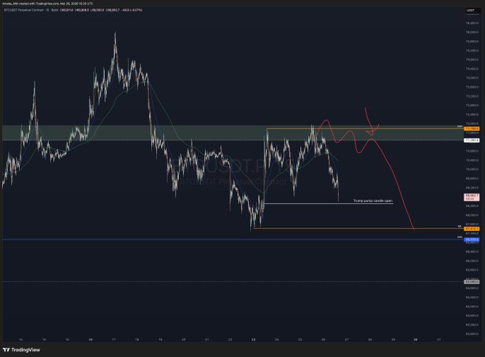 $BTC 하락장 전략을 잘 따르고 있네요. 중위권을 돌파했다가 다시 내려왔고, 72,000선 회복 시도조차 안 했습니다. 지금으로서는 트럼프의 상승세가 완전히 반전되어 중위권 부근으로 향할 것으로 예상합니다. 72,000선을 회복하면 상승장 전략을 다시 고려해 볼 수 있겠지만, 그 전까지는 전망이 밝지 않습니다. twitter.com/Ameba_NM/status/20...
